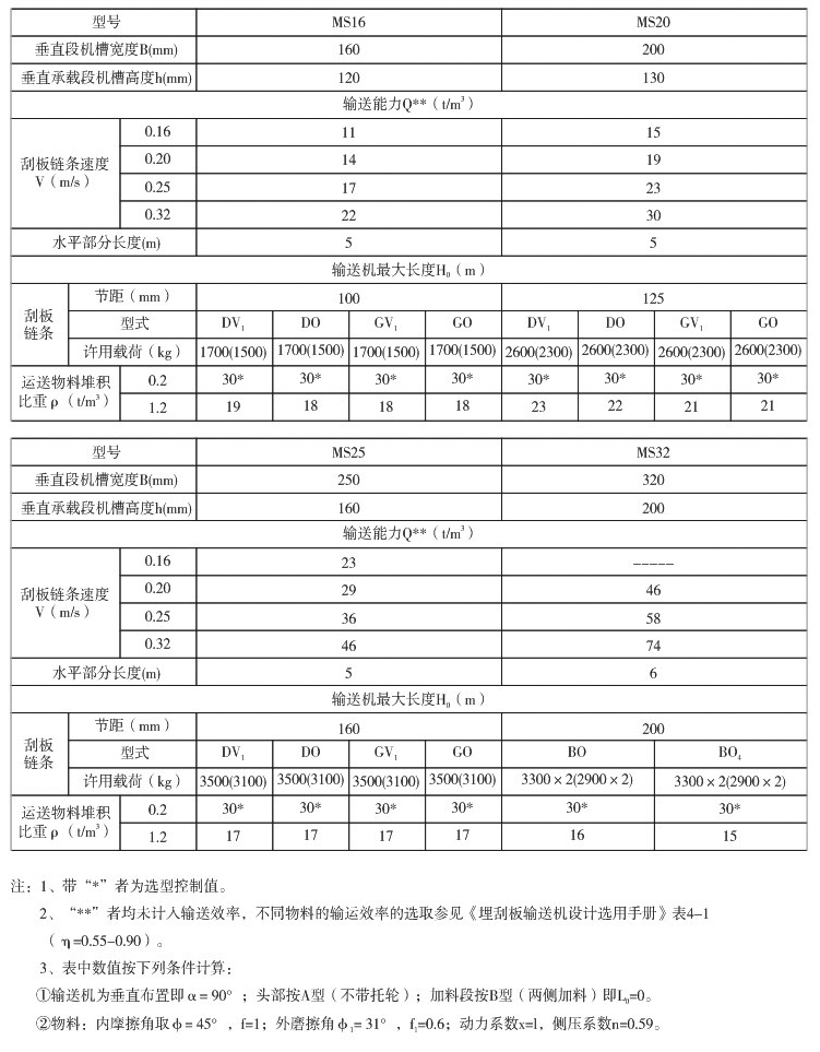 (一)MS型埋刮板輸送機技術(shù)性能表